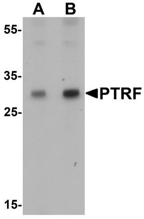 Western blot analysis of SDPR in HeLa cell lysate with SDPR antibody at (A) 1 and (B) 2 ug/ml |