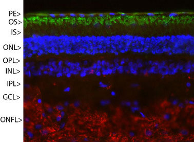 Pig retinal section stained with Rhodopsin / RHO antibody (green) and counterstained with rabbit... |