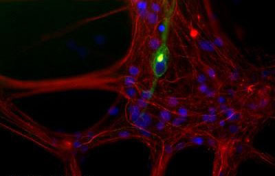 Mixed neuron/glia cultures from newborn rat brain stained with antibody to peripherin (green)...