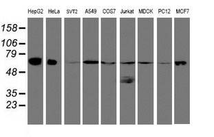 Western blot of extracts (35 ug) from 9 different cell lines by using g anti-UQCRC1 monoclonal...