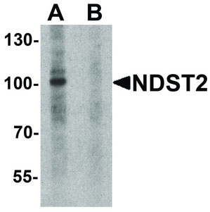 Western blot analysis of NDST2 in A-20 cell lysate with NDST2 antibody at 1 ug/ml in (A) the...