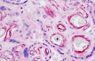 Anti-NID1 / Entactin / Nidogen antibody IHC staining of human placenta, endothelium.