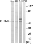 Western blot of extracts from HT-29/293/HeLa cells, using HTR2B Antibody. |