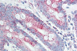 Anti-IL13RA1 antibody IHC staining of human small intestine.