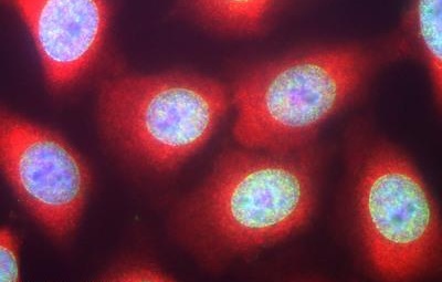 High power image of HeLa cells stained with chicken casein kinase 1 alpha antibody (red) and our...