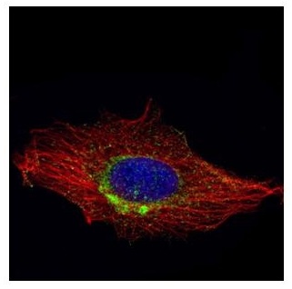 Confocal immunofluorescence analysis (Olympus FV10i) of methanol-fixed HeLa using RAB6A antibody...