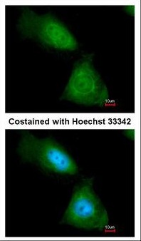 Immunofluorescence of paraformaldehyde-fixed HeLa using enolase 1 antibody at 1:200 dilution.
