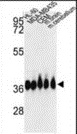 Western blot of PO4F3 Antibody (C-term) in HL-60, MDA-MB435, CEM cell line and mouse... |