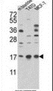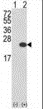 Western blot of ARF6 (arrow) using rabbit polyclonal ARF6 Antibody (Center). |