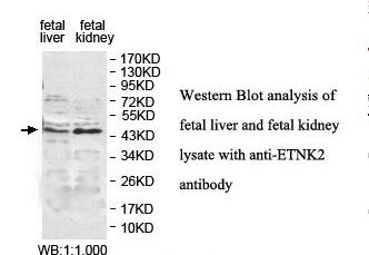 Western Blot analysis of fetal liver and fetal kidney lysate with anti-ETNK2 antibody |