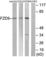 Western blot of extracts from HUVEC/COLO/COS cells, using FZD9 Antibody. |