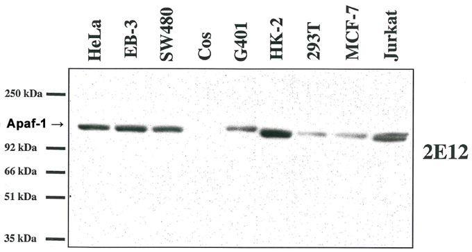 Western blot analysis using anti-Apaf-1 (human), MAb (2E12) on several human cell lines and one... |