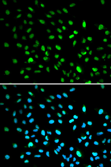 Immunofluorescence analysis of A549 cell using DDIT3 antibody. Blue: DAPI for nuclear staining.