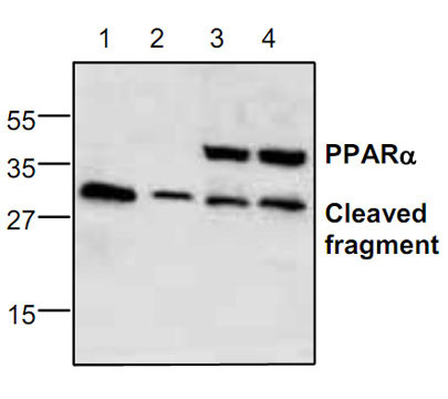 PPAR (Peroxisome proliferator-activated receptor) is a member of the nuclear hormone receptor superfamily and functions as a transcriptional activator. PPARα is preferentially expressed in liver, skeletal muscle, heart and kidney. PPARα is involved in regulation of lipid homeostasis. Its ligands include fatty acids, NSAIDs, prostaglandins, leukotriene B4, etc. PPARα transcriptionally regulates a variety of genes for enzymes and proteins involved in fatty acid metabolism and oxidation.