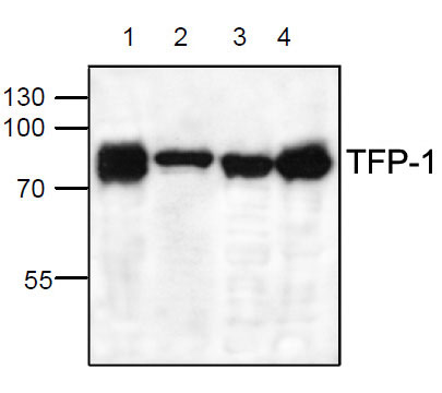 Western blot analysis of TFP-1 expression with lysate from Jurkat cells (Lane 1,2), 3T3 cells (Lane 3) and rat kidney (Lane 4). |