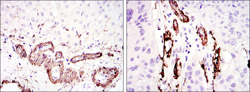 Figure 2: Immunohistochemical analysis of paraffin-embedded liver tissues (left) and lung cancer tissues (right) using ACTA2 mouse mAb with DAB staining. |