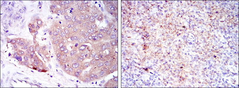 Figure 2: Immunohistochemical analysis of paraffin-embedded liver cancer (left) and submaxillary tumor (right) using EIF4E mouse mAb with DAB staining. |