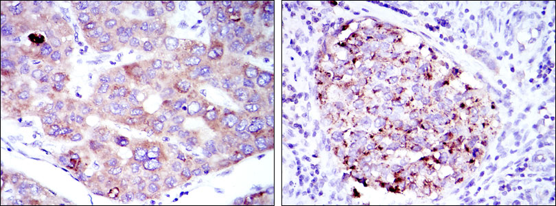 Figure 2: Immunohistochemical analysis of paraffin-embedded liver cancer tissues (left) and kidney cancer tissues (right) using EEF2 mouse mAb with DAB staining. |