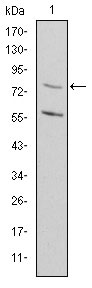 Figure 2: Western blot analysis using MTHFR mAb against HEK293 (1) and MTHFR(AA: 339-499)-hIgGFc transfected HEK293 (2) cell lysate. |