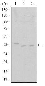 Figure 1: Western blot analysis using CDK9 mouse mAb against Jurkat (1), A431 (2) and HEK293 (3) cell lysate.