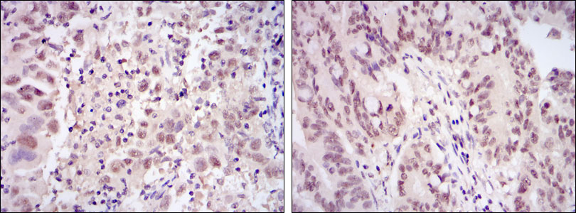 Figure 2: Immunohistochemical analysis of paraffin-embedded endometrial cancer tissues (left) and rectum cancer tissues (right) using CDK9 mouse mAb with DAB staining. |