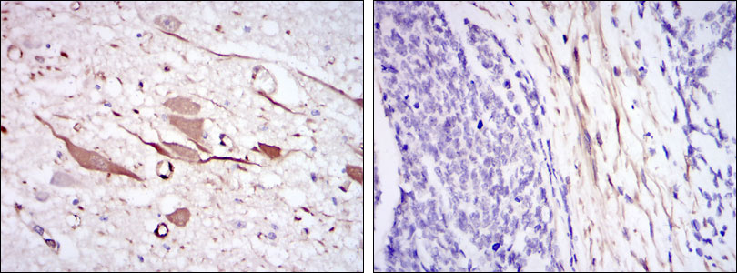 Figure 2: Immunohistochemical analysis of paraffin-embedded brain tissues (left) and esophageal cancer tissues (right) using HSP27 mouse mAb with DAB staining. |