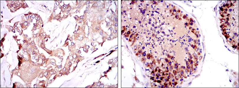Figure 2: Immunohistochemical analysis of paraffin-embedded breast cancer tissues (left) and testis tissues (right) using SMN1 mouse mAb with DAB staining. |