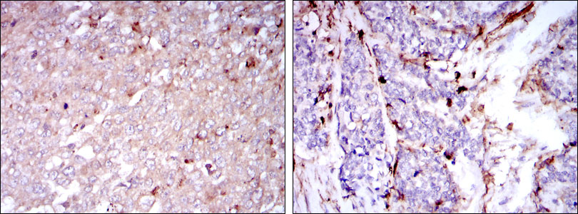 Figure 1: Immunohistochemical analysis of paraffin-embedded human breast cancer tissues (left) and human esophageal cancer tissues (right) using CD133 mouse mAb with DAB staining.