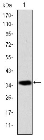 Figure 1: Western blot analysis using AIF mAb against human AIF (AA: 1-261) recombinant protein. (Expected MW is 35.6 kDa)