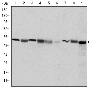 Figure 2: Western blot analysis using CCT2 mouse mAb against Hela (1), MCF-7 (2), Jurkat (3), T47D (4), K562 (5), A431 (6), NIH/3T3 (7), PC-12 (8) and Cos7 (9) cell lysate. |