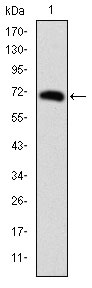 Figure 1: Western blot analysis using FOXP2 mAb against human FOXP2 (AA: 47-287) recombinant protein. (Expected MW is 52.8 kDa) |