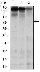 Figure 2: Western blot analysis using MSH6 mouse mAb against MCF-7 (1), HEK293 (2), and HCT116 (3) cell lysate. |