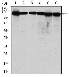Figure 2: Western blot analysis using MCM2 mouse mAb against MCF-7 (1), Hela (2), Jurkat (3), K562 (4), HEK293 (5) and HEPG2 (6) cell lysate. |