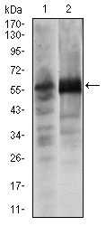 Figure 2: Western blot analysis using SOX9 mouse mAb against Lovo (1) and SW620 (2) cell lysate. |
