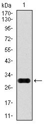Figure 1: Western blot analysis using GPC3 mAb against human GPC3 (AA: 55-200) recombinant protein. (Expected MW is 28.5 kDa)