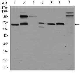 Figure 2: Western blot analysis using GPC3 mouse mAb against HepG2 (1), HEK293 (2), Jurkat (3), SK-N-SH (4), PC-12 (5), F9 (6)and Mouse liver (7) cell lysate. |
