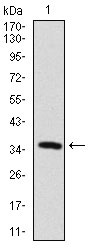 Figure 1: Western blot analysis using MAP2 mAb against human MAP2 recombinant protein. (Expected MW is 36.1 kDa)