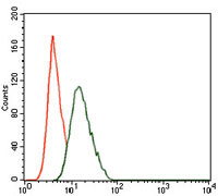 Figure 4: Flow cytometric analysis of NIH3T3 cells using PIK3R1 mouse mAb (green) and negative control (red). |