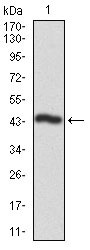 Figure 1: Western blot analysis using CSNK2A2 mAb against human CSNK2A2 recombinant protein. (Expected MW is 44 kDa)