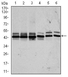 Figure 2: Western blot analysis using CSNK2A2 mouse mAb against HeLa (1), MCF-7 (2), HepG2 (3), Jurkat (4), NIH3T3 (5), and PC-12 (6) cell lysate. |