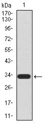 Figure 1: Western blot analysis using UTF1 mAb against human UTF1 recombinant protein. (Expected MW is 32.8 kDa)