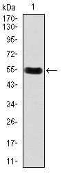 Figure 1: Western blot analysis using DKK3 mAb against human DKK3 recombinant protein. (Expected MW is 54.4 kDa)