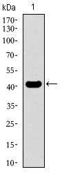Figure 1: Western blot analysis using KLF1 mAb against human KLF1 recombinant protein. (Expected MW is 42.6 kDa)