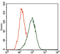 Figure 2: Flow cytometric analysis of HeLa cells using KLF1 mouse mAb (green) and negative control (red). |