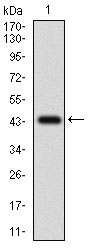 Figure 1: Western blot analysis using CFLAR mAb against human CFLAR recombinant protein. (Expected MW is 42.9 kDa)