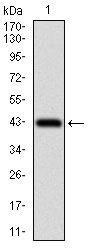 Figure 1: Western blot analysis using ZEB1 mAb against human ZEB1 recombinant protein. (Expected MW is 41.7 kDa)
