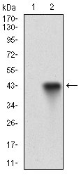 Figure 2: Western blot analysis using CD22 mAb against HEK293 (1) and CD22 (AA: 621-725)-hIgGFc transfected HEK293 (2) cell lysate. |