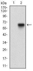 Figure 2: Western blot analysis using TIE1 mAb against HEK293 (1) and TIE1 (AA: 385-607)-hIgGFc transfected HEK293 (2) cell lysate. |