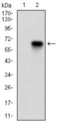 Figure 2: Western blot analysis using CDKN2A mAb against HEK293 (1) and CDKN2A (AA: 1-156)-hIgGFc transfected HEK293 (2) cell lysate. |