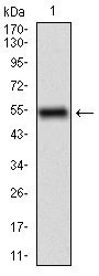 Figure 2: Western blot analysis using CD68 mAb against HEK293 (1) and CD68 (AA: 42-155)-hIgGFc transfected HEK293 (2) cell lysate. |